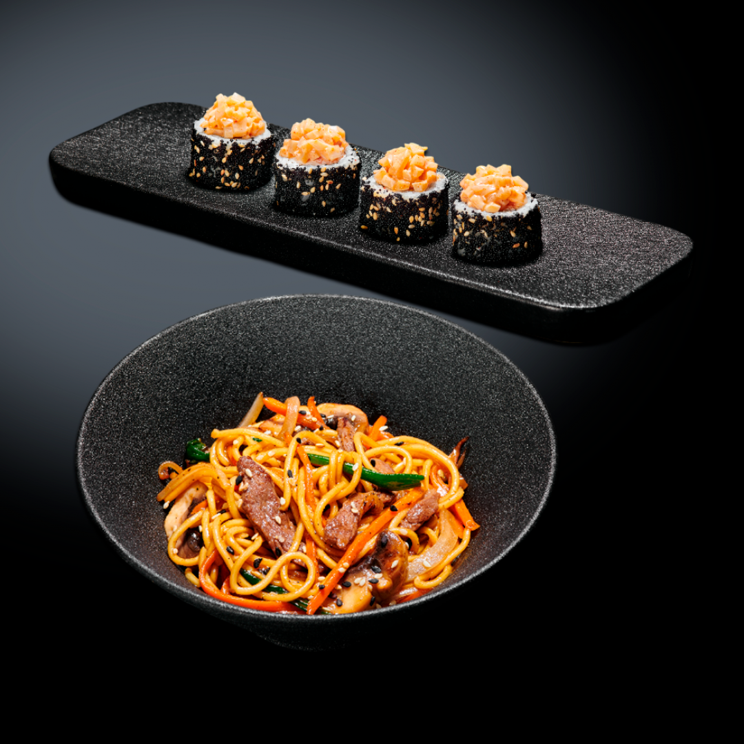 Лапша рамен, говядина, шампиньоны, лук, морковь, соус перечный терияки, зеленый лук, кунжут