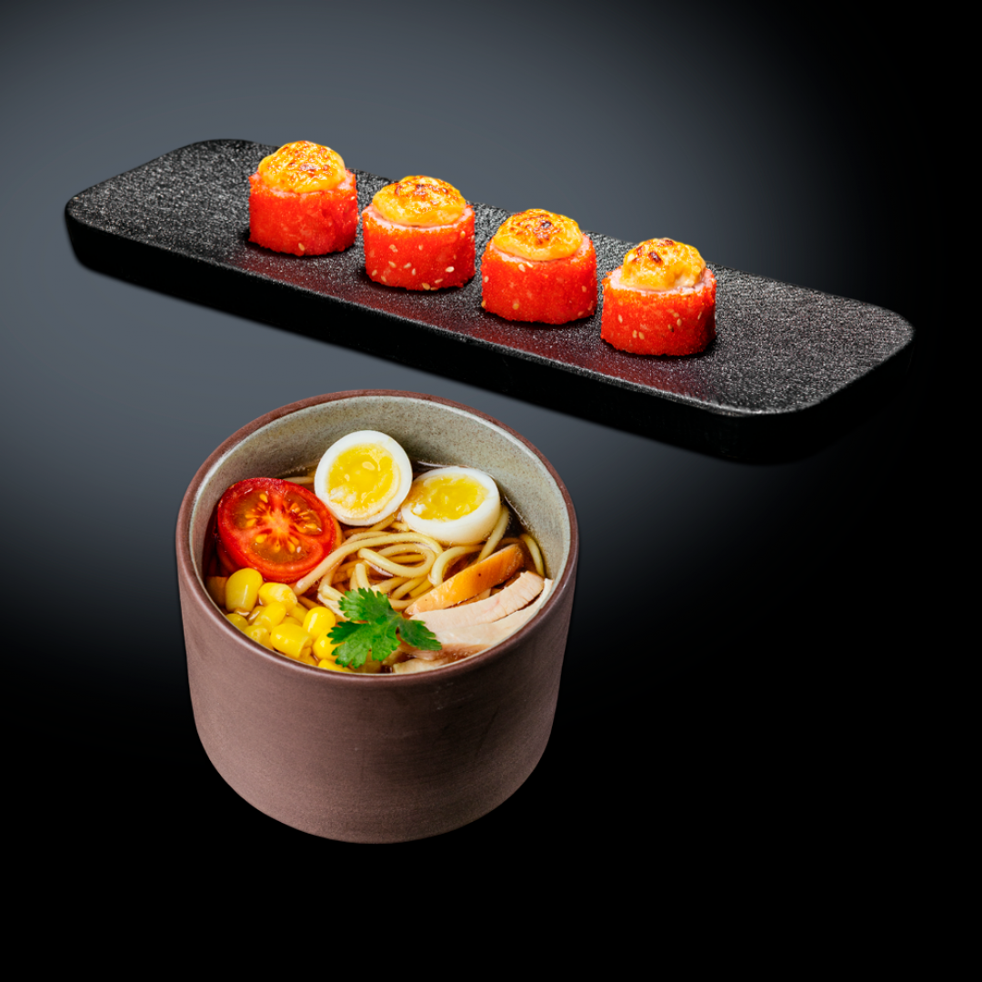 Рамен бульон, лапша рамен, копченое филе цыпленка, перепелиное яйцо, кукуруза, томаты черри, зеленый лук