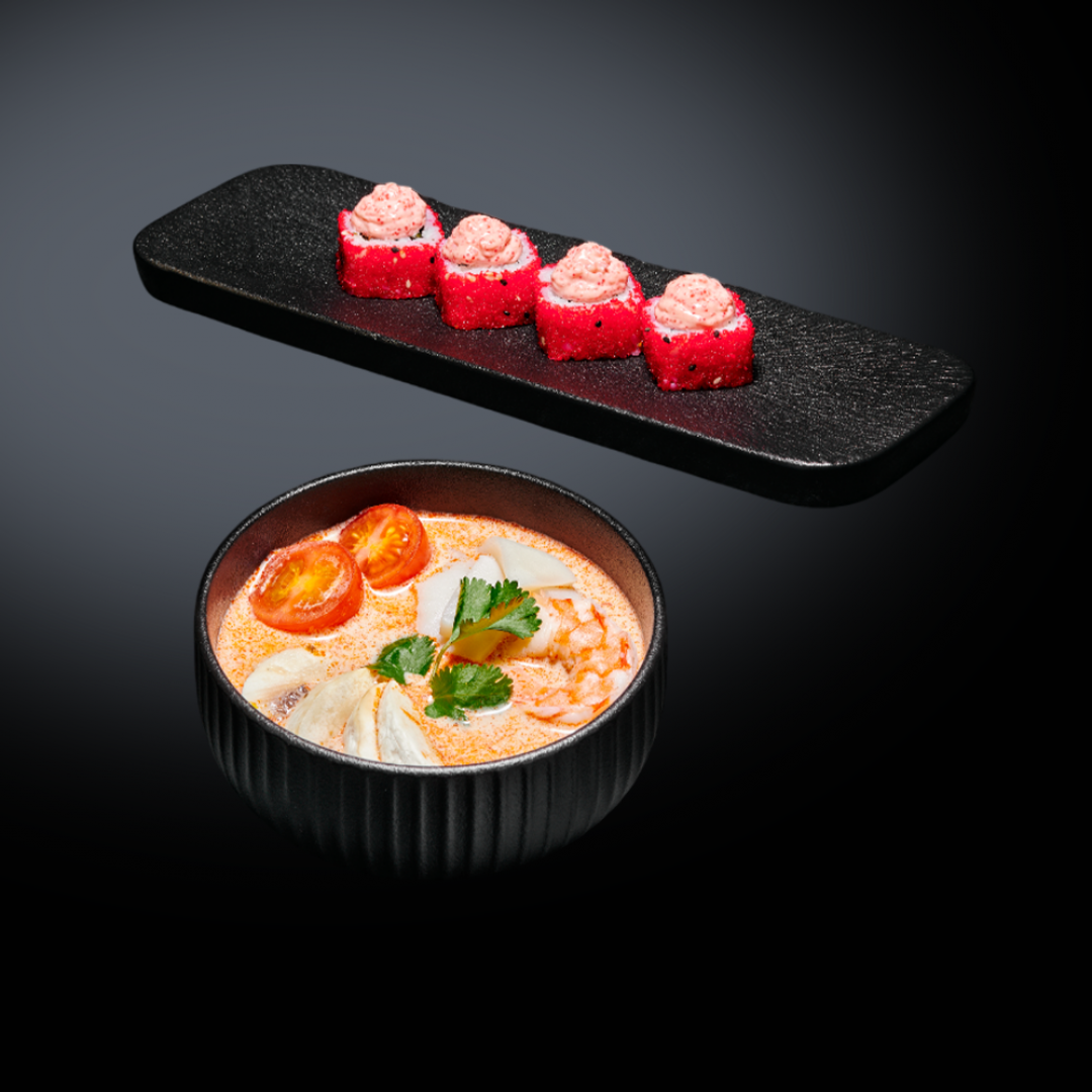 Рис, нори, сыр творожный, креветка, огурец, икра масаго, соус лава с кальмаром