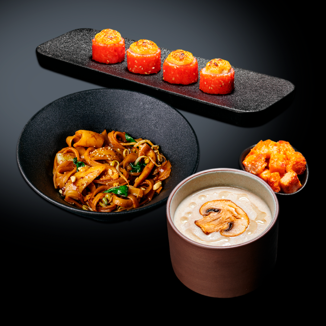 Рис, нори, филе куриное копченое, сыр плавленный, тамаго, темпурный кляр, панировочные сухари, соус «Кайсен», соус чесночный, масло фритюрное