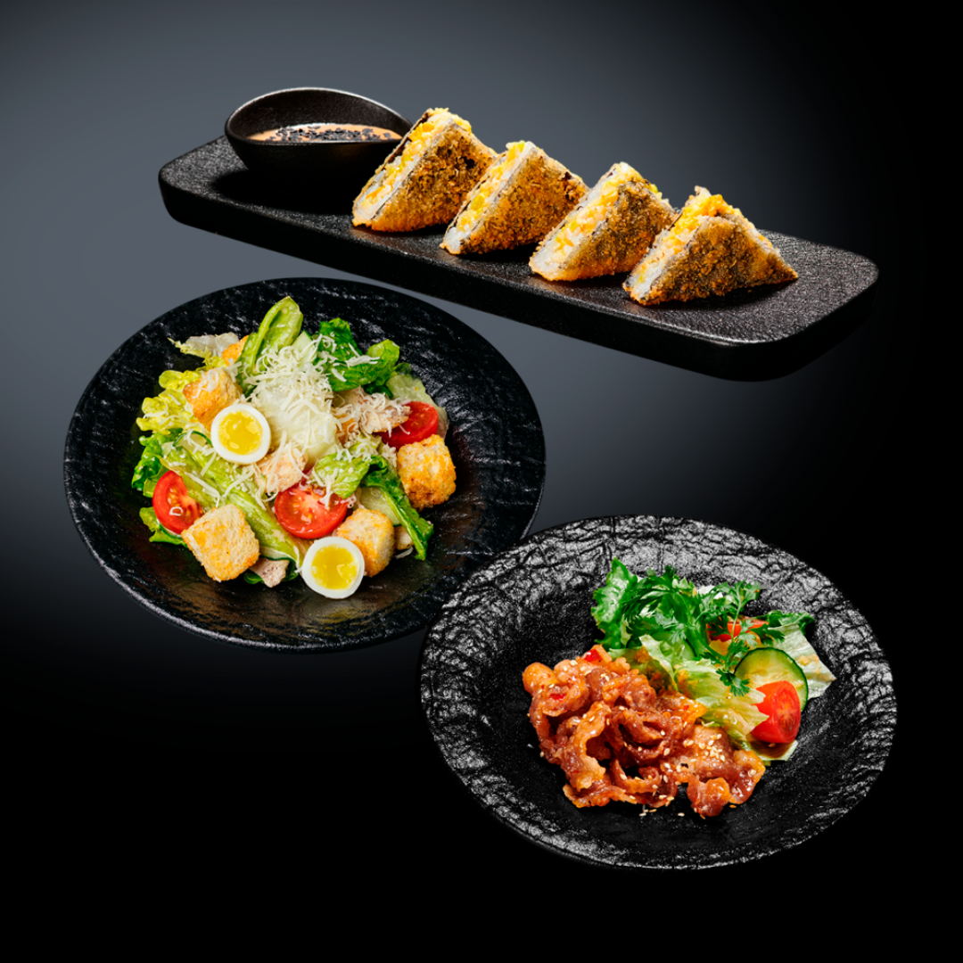 Рис, нори, филе куриное копченое, сыр плавленный, тамаго, темпурный кляр, панировочные сухари, соус «Кайсен», соус чесночный, масло фритюрное