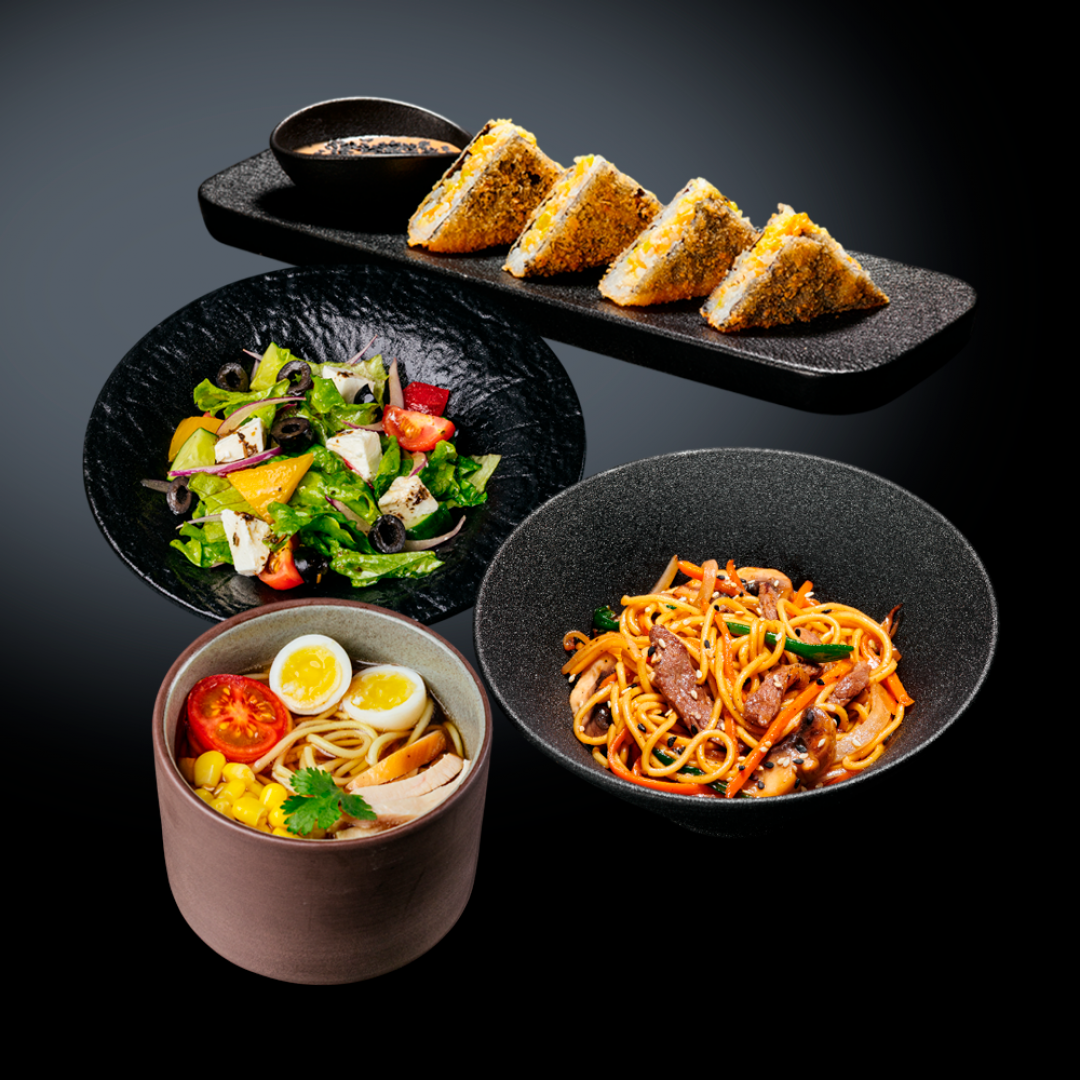 Лапша рамен, говядина, шампиньоны, лук, морковь, соус перечный терияки, зеленый лук, кунжут