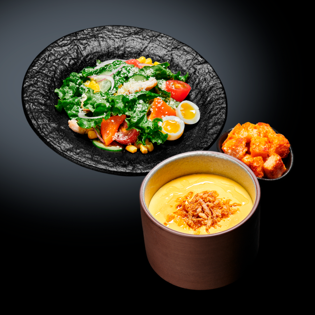 Цыпленок жареный, болгарский перец, огурец, кукуруза, яйцо перепелиное, лист салата, томаты черри, пармезан, лук красный, соус