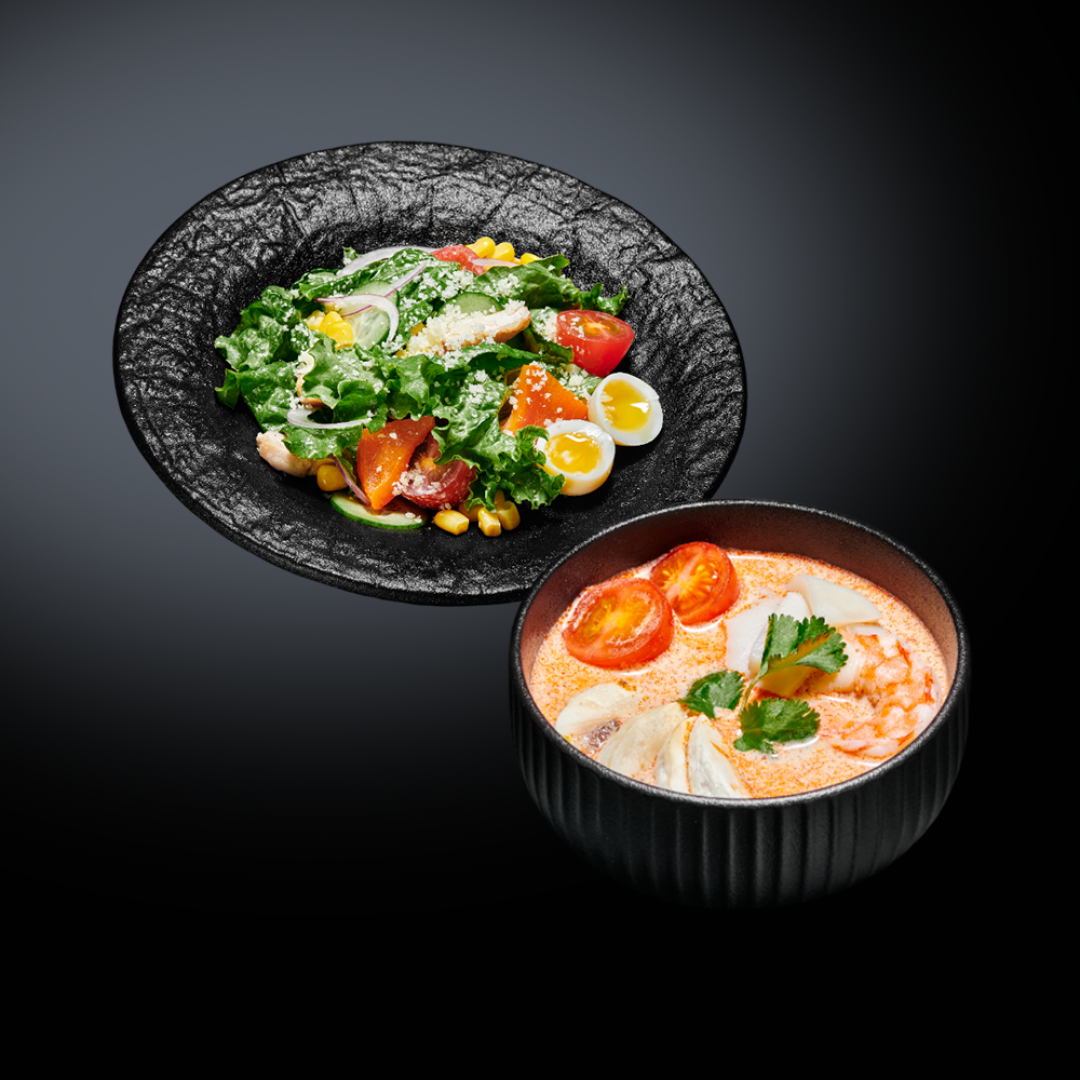 Рамен бульон, лапша рамен, копченое филе цыпленка, перепелиное яйцо, кукуруза, томаты черри, зеленый лук