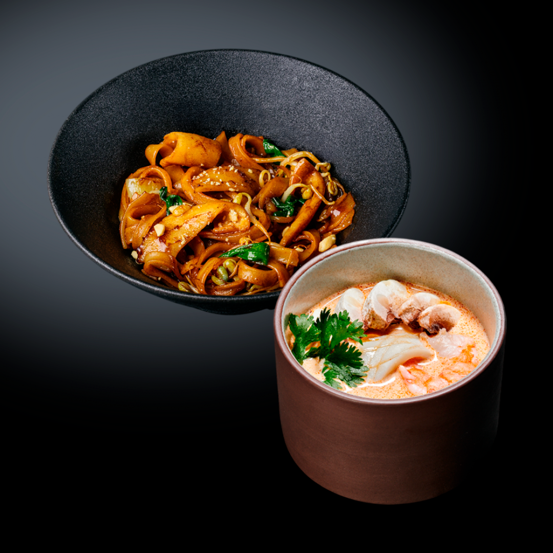 Рисовая лапша, кальмар, жаренный арахис, зеленый лук, репчатый лук, проростки, соус пад тай