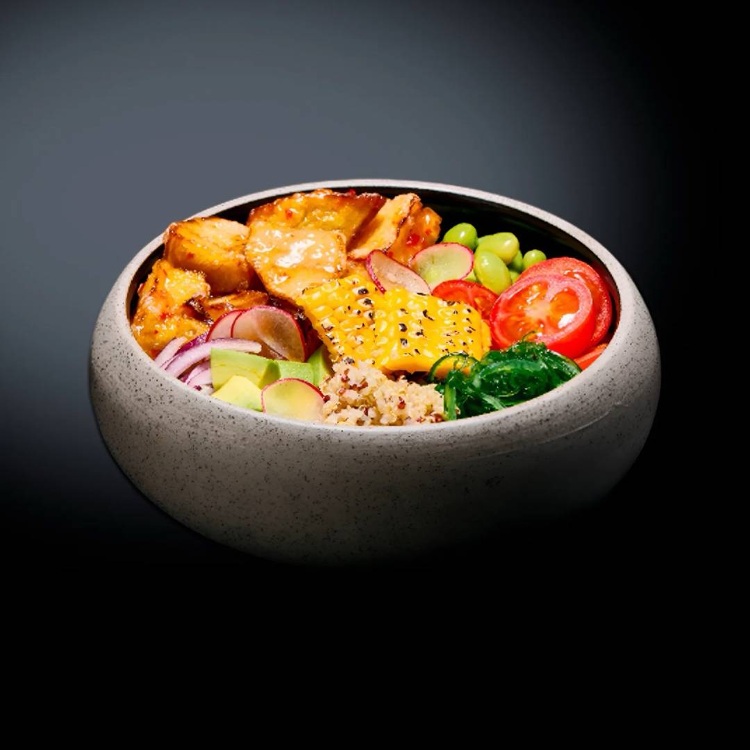 Киноа, авокадо, томаты черри, огурец, редис, баклажан, морковь, кукуруза, красный лук, салат айсберг, водоросли чука, эдомамэ, соус сладкий чили.