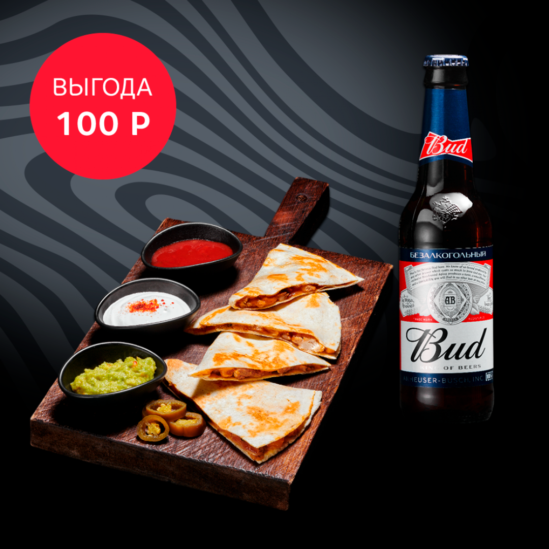 Лепешка тортилья, куриное бедро, шампиньоны, перец болгарский, кукуруза, соус сырный бешамель, перец халапеньо, соус сальса острый, соус гуакамоле, сметана, приправа тогарасси