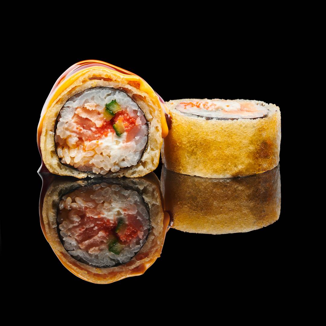 Водоросли нори, рис, сыр творожный, тунец, авокадо, огурец свежий, икра масаго, соус спайси, соус унаги, темпура